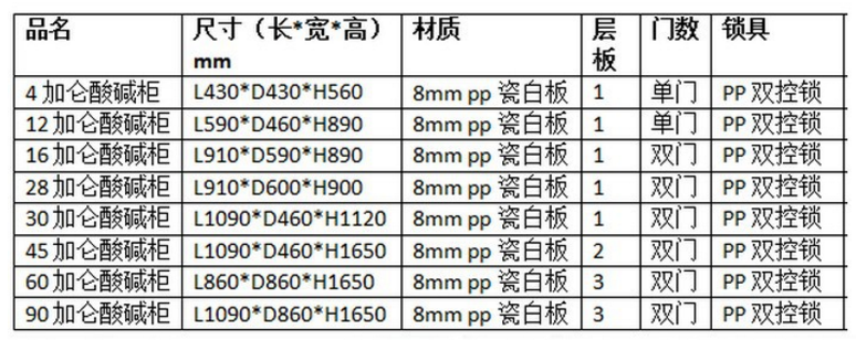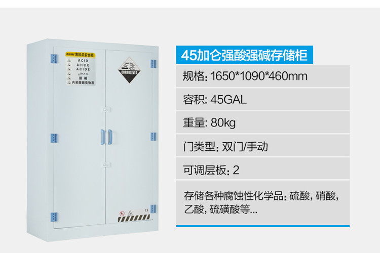 強(qiáng)酸堿儲(chǔ)存柜具有耐強(qiáng)酸、強(qiáng)堿與抗腐蝕。適用于實(shí)驗(yàn)室各類化學(xué)品及器皿的安全存儲(chǔ)。